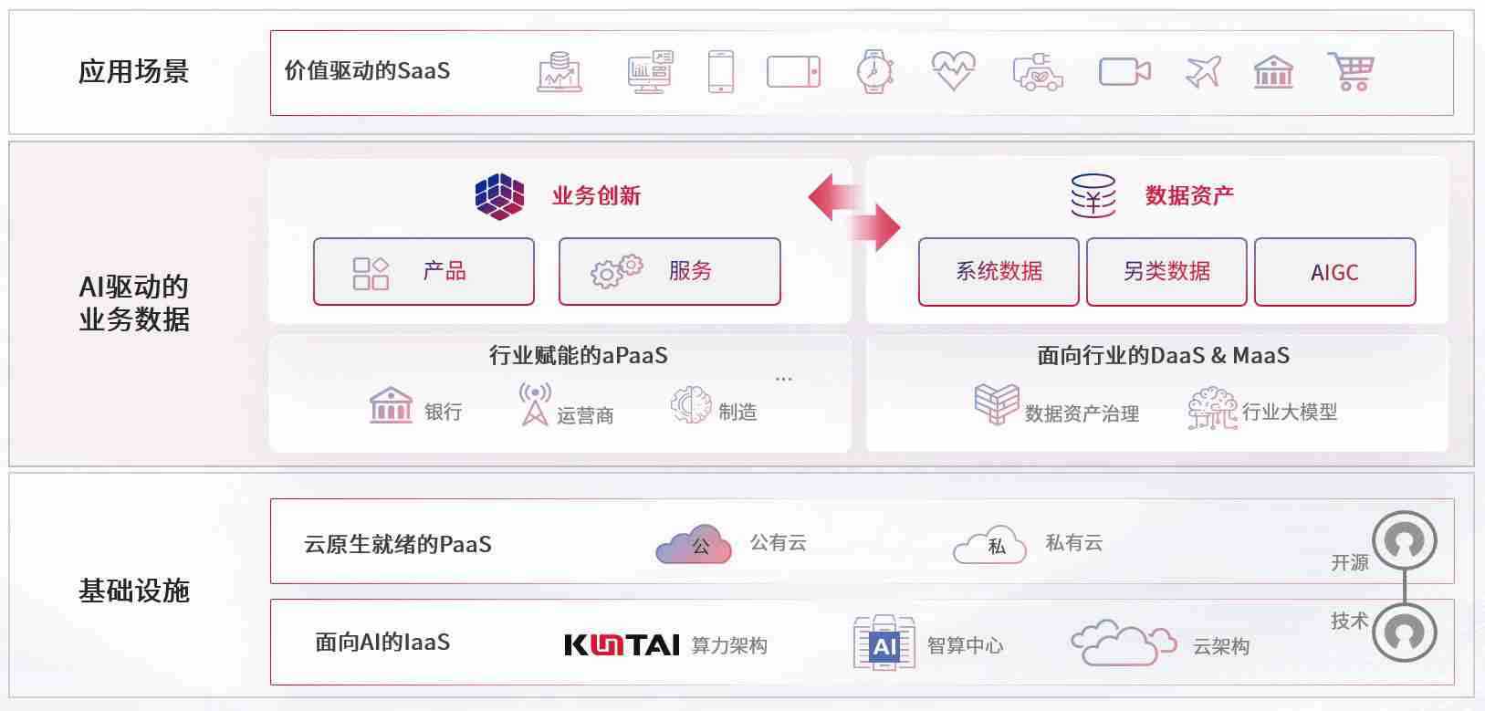 数字时代,,,,围绕企业数字化转型的关键要素,,尊龙z6数码开创性的提出数云融合战略和技术体系框架,,,,着力在云原生、、数字原生、、、、AI原生和信创产业上架构产品和服务能力,,为处在不同数字化转型阶段的快消零售、、汽车、、、、金融、、医疗、、、政企、、教育、、、运营商等行业客户提供泛在的敏捷IT能力和融合的数据驱动能力,,构建跨界融合创新的数字业务场景和新业务模式,,,,助力企业级客户建立面向未来的核心能力和竞争优势,,,,全面推动社会的数字化、、、智能化转型升级。。。